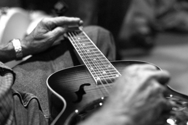 É muito comum observar os instrumentistas tocar o Dobro na posição horizontal, colocando o instrumento sobre as suas pernas, como se observa na imagem.